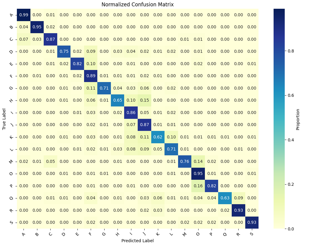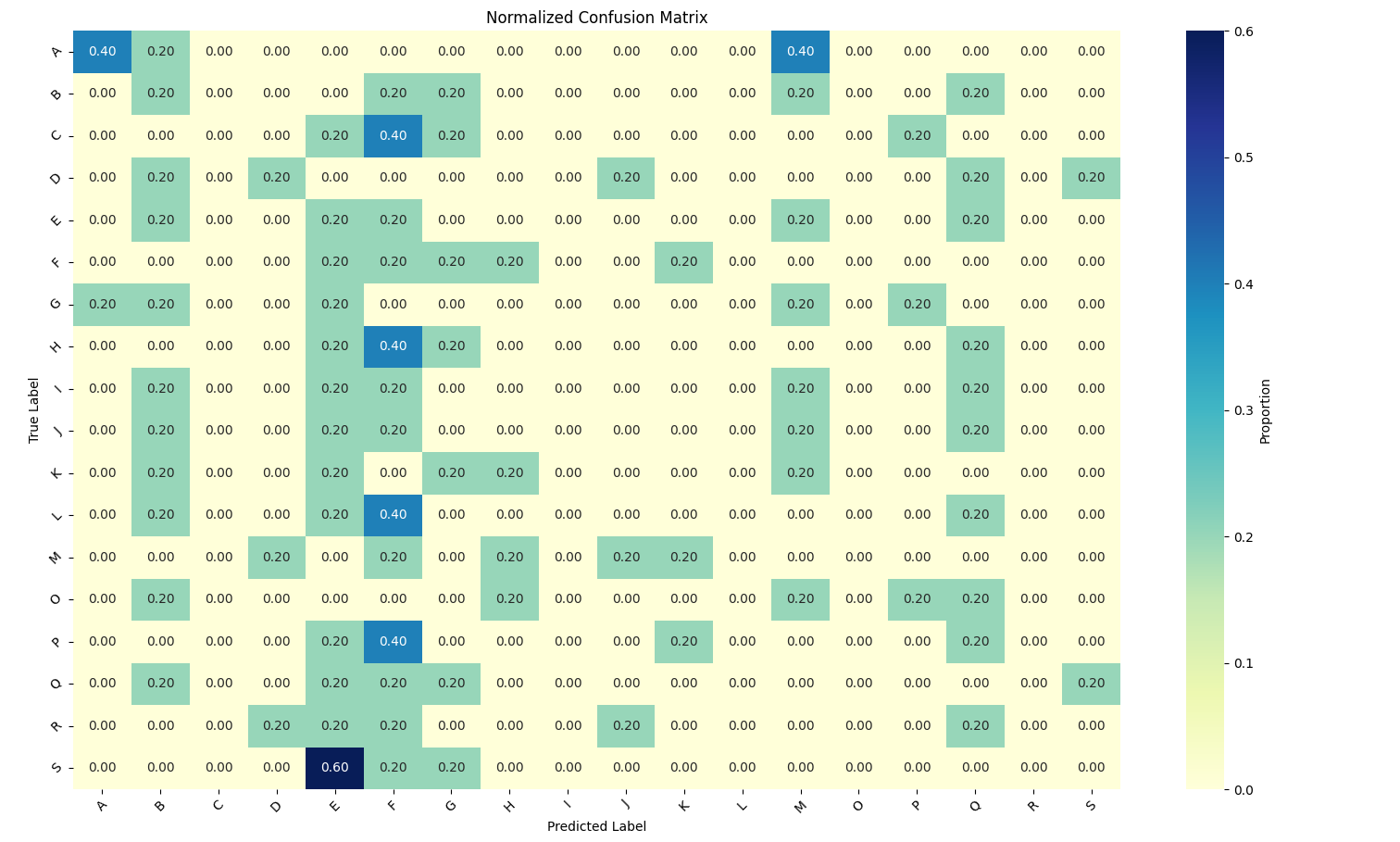 Plotting a normalized confusion matrix of the test predictions, it’s immediately evident that the LLM could not predict movement type with any sort of accuracy. Additionally, this is the least transparent classification method demonstrated so there is no process for getting insight into how the LLM used the training data and therefore diagnose where it might have gone wrong.