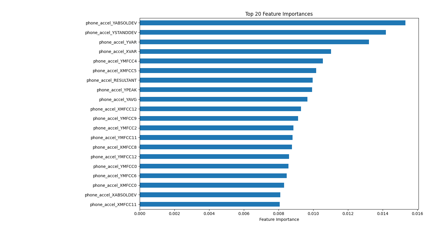 A random forest is also comparatively more interpertable than LLMs and neural network. Scikit-learn models have a feature importances attribute model.feature_importances_ that can be easliy accessed, sorted and ploted in a bar chart. For this random forest model, the most important feature for predicting movement type is
