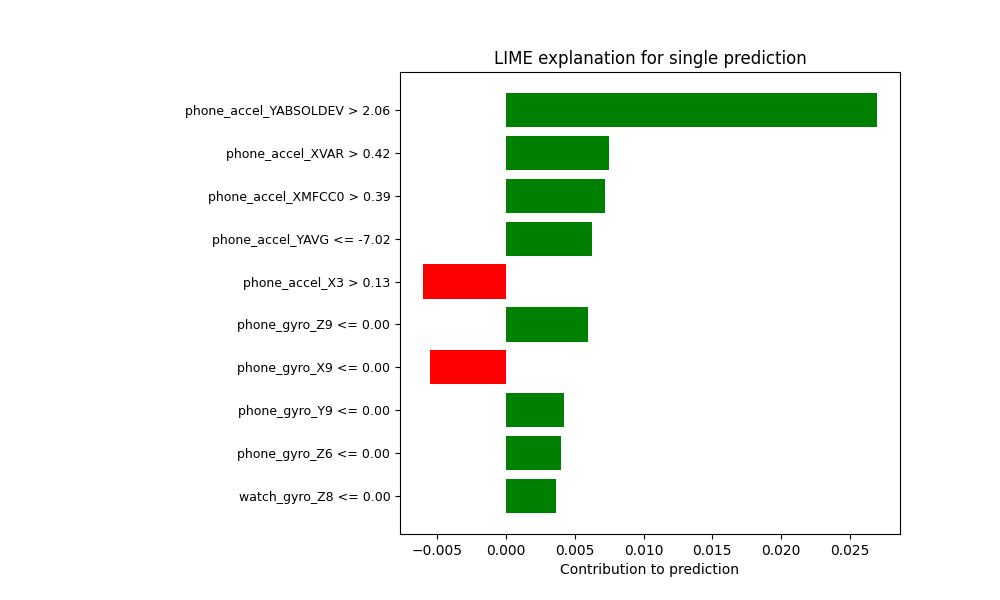 In a LIME explanation, the weights can be positive or negative, and they tell you whether a feature is pushing the prediction toward the predicted class or away from it. Positive weights indicate the feature value contributes in favor of the selected class, whereas negative weights indicate the feature contributes against the model predicting that class. Plotting these values we can see a visual representation of the weights for this particular prediciton, and conclude that having phone_accel_X3 > 0.13 slightly decreases the likelihood of the predicted activity class.