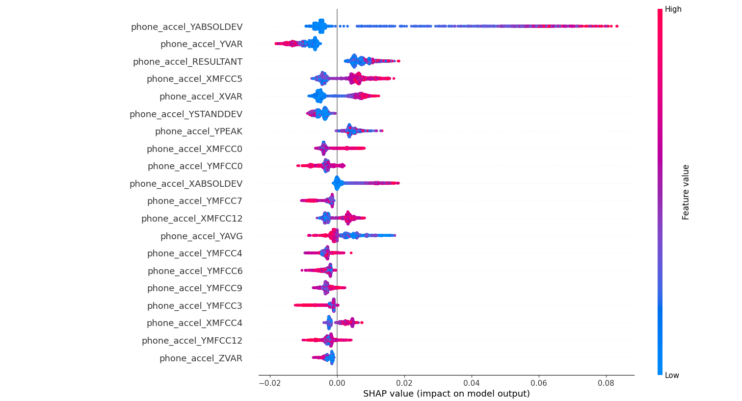 For a detailed, highly interpertable examination of feature importance, calculating and plotting feature shap (SHapley Additive exPlanations) values can provide insight into both global (across all predictions) and local (for a single prediction) feature importances. Derrived from game theory, each feature’s SHAP value is like its “fair share” of responsibility for moving the prediction away from the baseline (average) prediction. Positive SHAP values push the prediction higher, while negative ones push it lower. The visualization of shap values clearly shows that the feature phone_accel_YABSOLDEV has a strong infulence on model predictions, particularly at higher values.